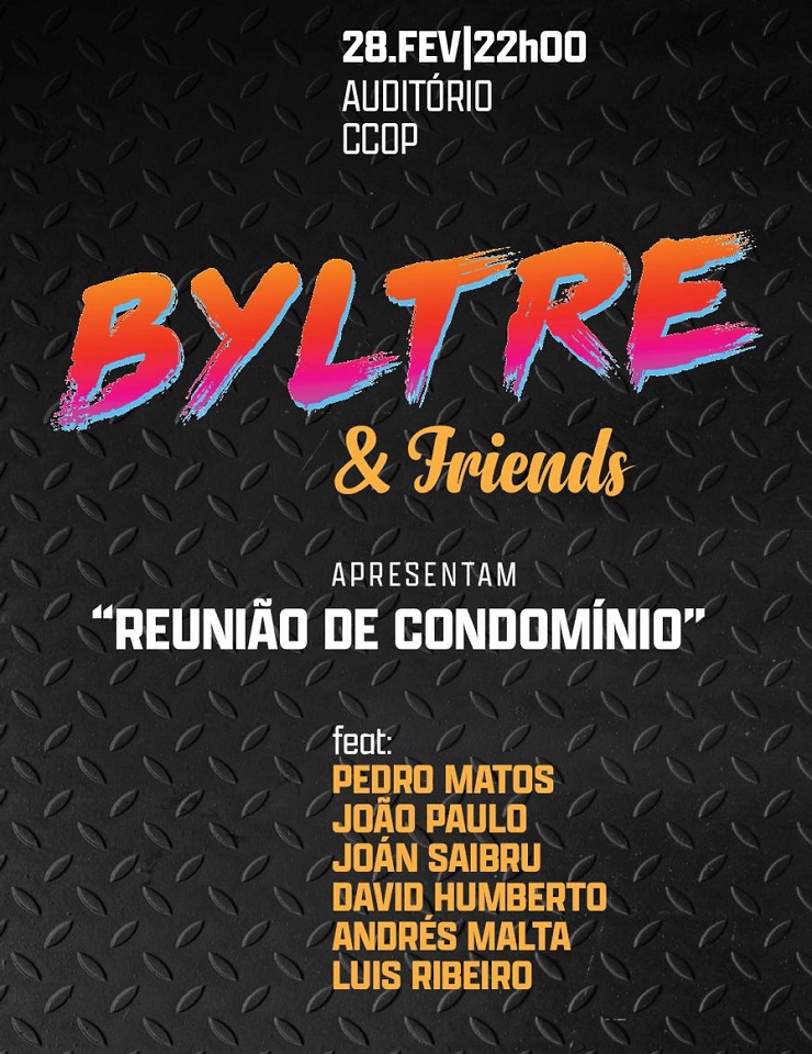 Do Bairro da Vitória para o mundo, os BYLTRE (Alex Byltre e Paul Byltraz) rimam Arpeggiators distorcidos com Saramago, guitarras no limite da explosão com o bairro do cerco, Estoicismo com Espadal, numa amálgama sonora que cobre mais de 30 anos de música Pop/Rock. Com eles trazem convidados resgatados à própria origem da banda como Pedro Matos e David Humberto (BUENA.) ,João Paulo (Sentido Único), os músicos extraordinaire Luis Ribeiro e Andrés Malta e ainda Joán Saibru, artista azerbaijano que aterra de avião diretamente do Cáucaso para participar no concerto de apresentação do disco de estreia (e último disco) "Reunião de Condomínio". O concerto do ano…ou não. Imperdível.